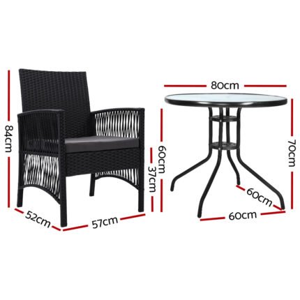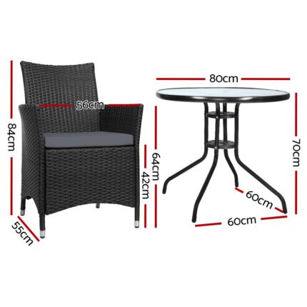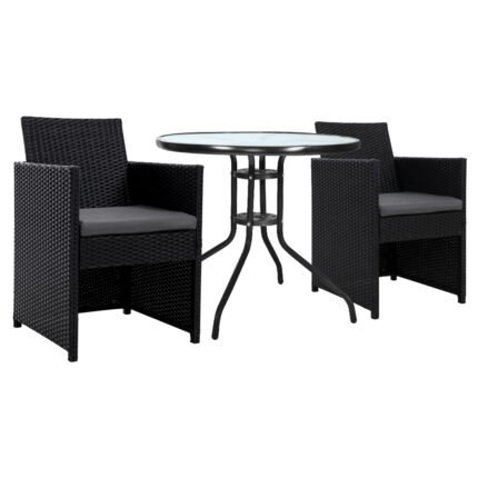 Gardeon 3PC Bistro Set Outdoor Furniture Rattan Table Chairs Patio Garden Cushion Black