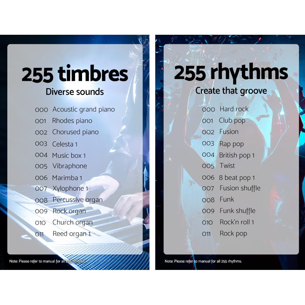 With 61 full-size and lighted keys, the Alpha Portable Keyboard enables you to discover a whole new world of music with some of these exceptional built-in features: 255 rhythms, 255 timbres, tempo and volume control, 50 demo songs, multiple chord options, various effects controls, 61 percussion selects, keyboard split, record and playback, and many more. You can programme the Keyboard to assist with your compositions and the 3-step intelligent training function helps you to learn to play better with minimum fuss.