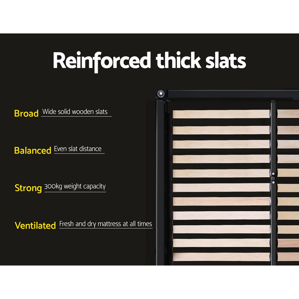 From the outside, our contemporary Artiss Tiyo Gas Lift Bed Frame looks absolutely plush. The premium PVC leather tufted headboard and sides all exudes fine craftsmanship. But there is more to this luxurious bed frame than meets the eye. Lift up the frame and you will find acres of storage space under the wooden arched slat base. The gas lift system and hand strap enable you to effortlessly lift the bed to store all your seasonal beddings and linen such as extra quilts, pillows and comforters and more. The wooden arched slat base is also designed to flex appropriately so that it can better distribute the weight exerted on it. Overall, the bed frame is well-built with reinforced steel bars within its sturdy steel frame. Heavy-duty metal connectors keep the frame sturdy with additional central support from an adjustable centre support beam. Enjoy your wonderful sleep in more ways than one with our innovative Tiyo Gas Lift Bed Frame.