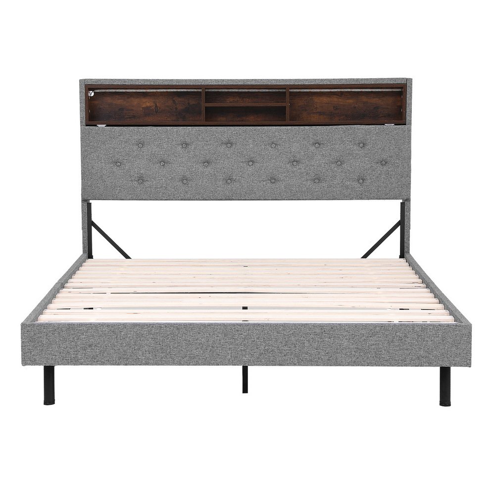 Elevate your bedroom with the Artiss Double Storage Bed Frame. Features smart RGB LED lights offering flexible ambiance settings. The practical headboard provides multi-layer shelving, while discreet under-bed space offers ample storage. Relax against the comfortable padded and tufted headboard. Built with a durable timber and steel frame and supportive LVL slats, this reliable platform bed frame supports double mattresses. The modern grey faux linen finish complements contemporary decor. Assembly is straightforward.