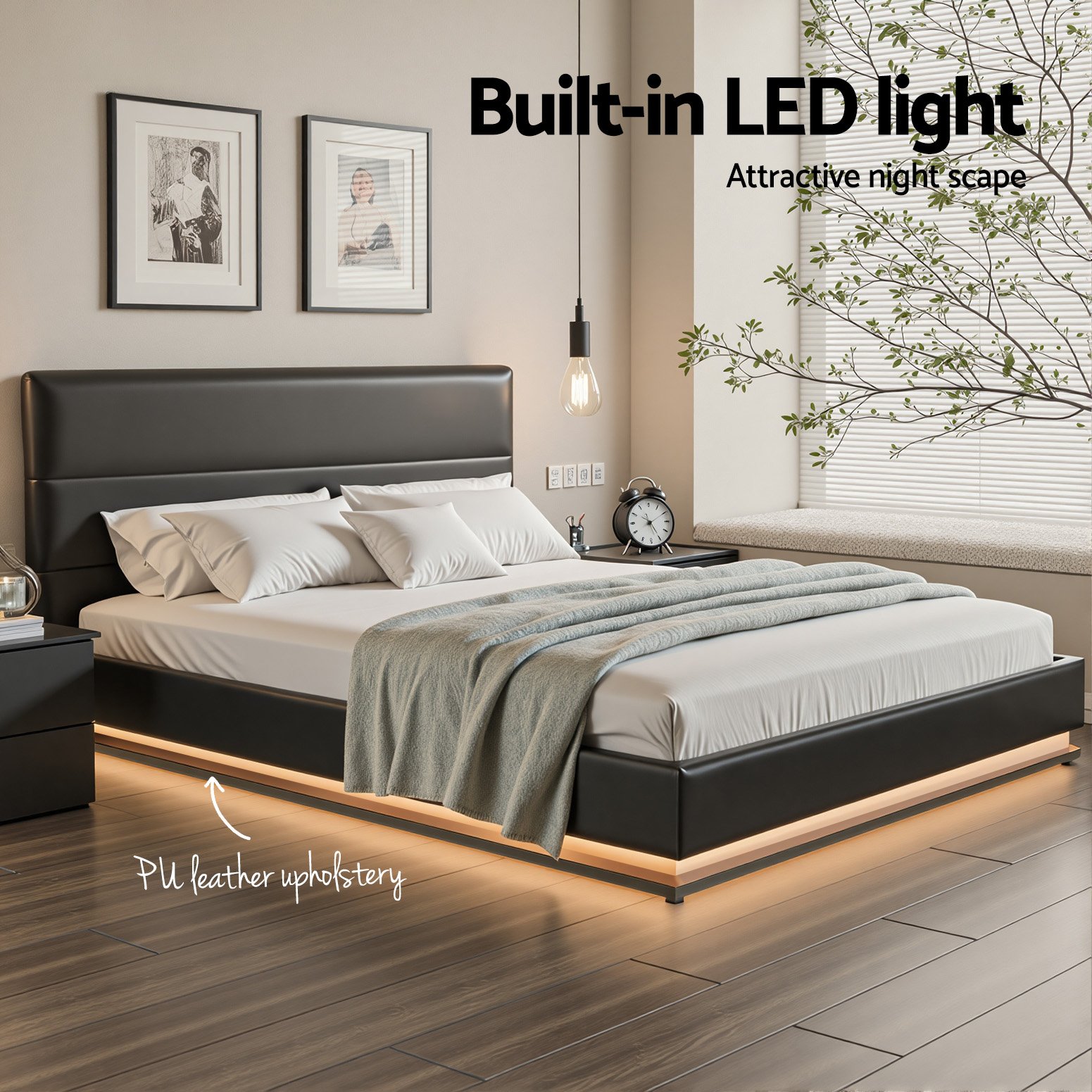 When is a bed more than a bed? When it uses our Artiss LUMI Gas Lift Bed Frame. On the outside, this bed frame looks like just any other quality bed frame. Beautifully padded with generous foam and covered in PVC leather. Strong steel frame with high grade steel centre rails, heavy-duty bars and arched slat base. Large and comfortable headboard. But with one easy gas lift of the bed base, the bed frame becomes an instant storage area with acres of space for your bedding essentials. Simply store your extra pillows, bed sheets, cushions and more in the storage compartment and hide them away for the season. Even better, you no longer have to fumble in the dark for a light switch in the middle of the night with this bed frame. It comes with built-in LED lighting that can be customised into 16 different colours and 4 flashing modes to suit your preference. Not only will the illuminated bed frame create a beautiful ambience, it will also save you from buying extra bedside lamps or nightlights. So do not just get any bed frame, get this 3-in-1 bed frame to expand your home storage capacity and light up your nights with just a lift of your hands.