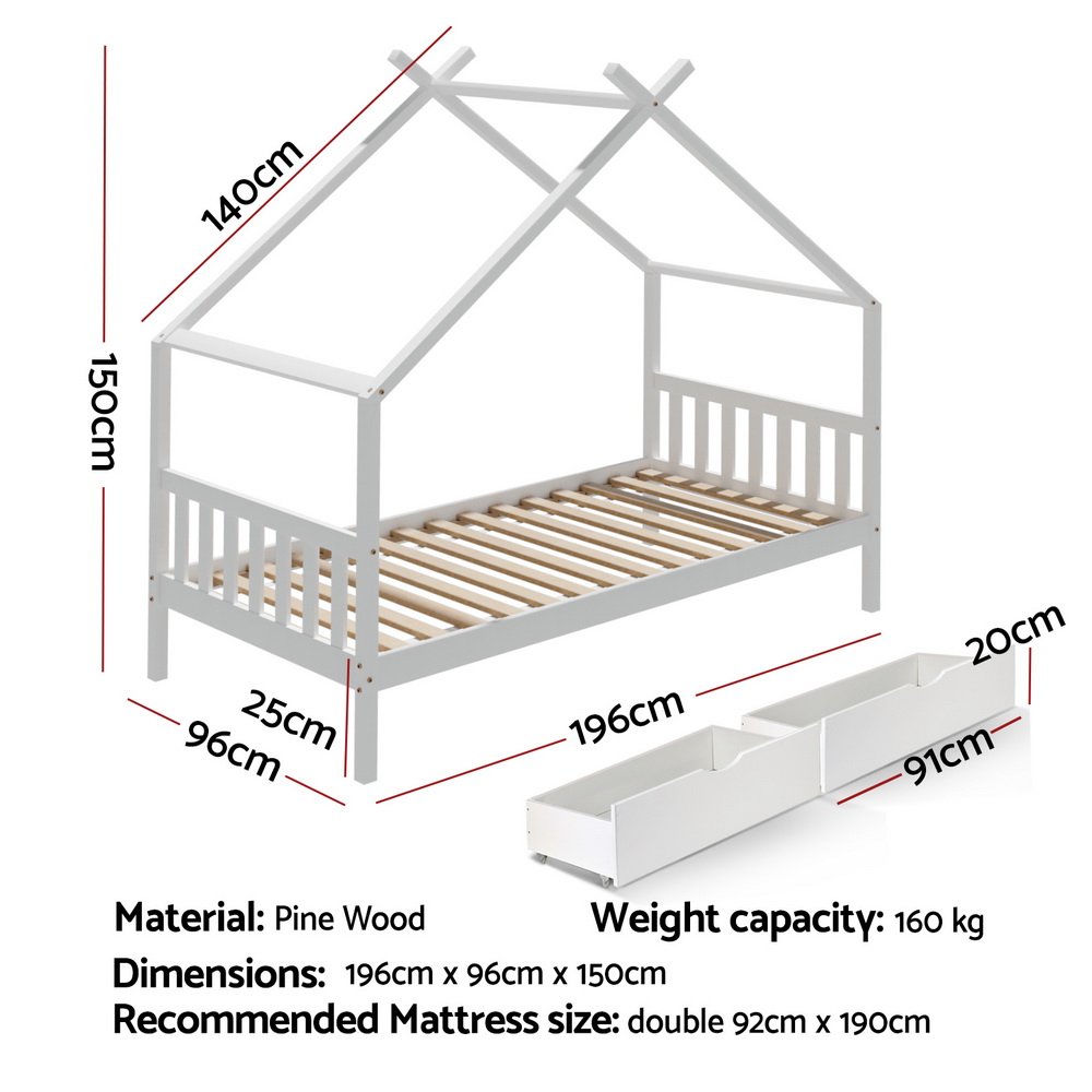 Artiss Bed Frame Wooden Base Kids Single Timber House with 2 Storage Drawers Beds White