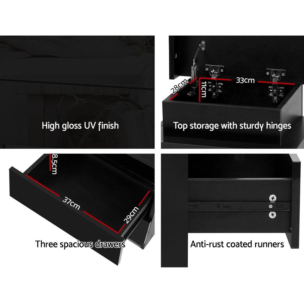 Artiss Bedside Table LED 3 Drawers – COLEY Black