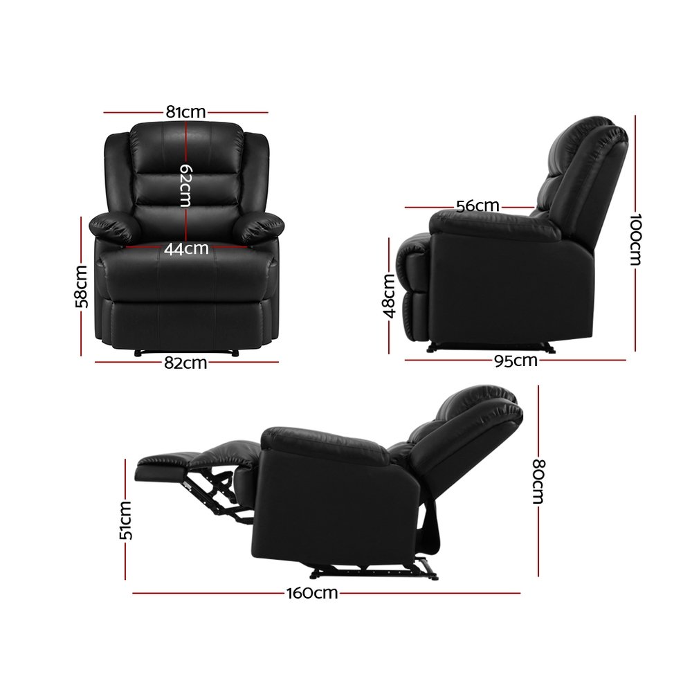 Enjoy the gold class movie experience in your own home with our Artiss Recliner Chair. Richly padded in high-resilience foam and upholstered in smooth and luxurious PU leather, the chair certainly looks like it belongs in gold class. In the upright position, the recliner is a comfortable armchair where you can sit for long chats with guests. Or you can easily adjust the backrest and footrest to recline to your preferred angle. The backrest has three padded zones for full head and back support so that no matter the tilt, you have total body comfort. The chair is suitable in any room with its classic design. Keep it in your study to be perfectly rested during your work breaks. In the living room for watching television or listening to music. Or keep several in the media room for the complete cinema experience. Wherever you decide to put it, you can always sit back and relax on our recliner chair.