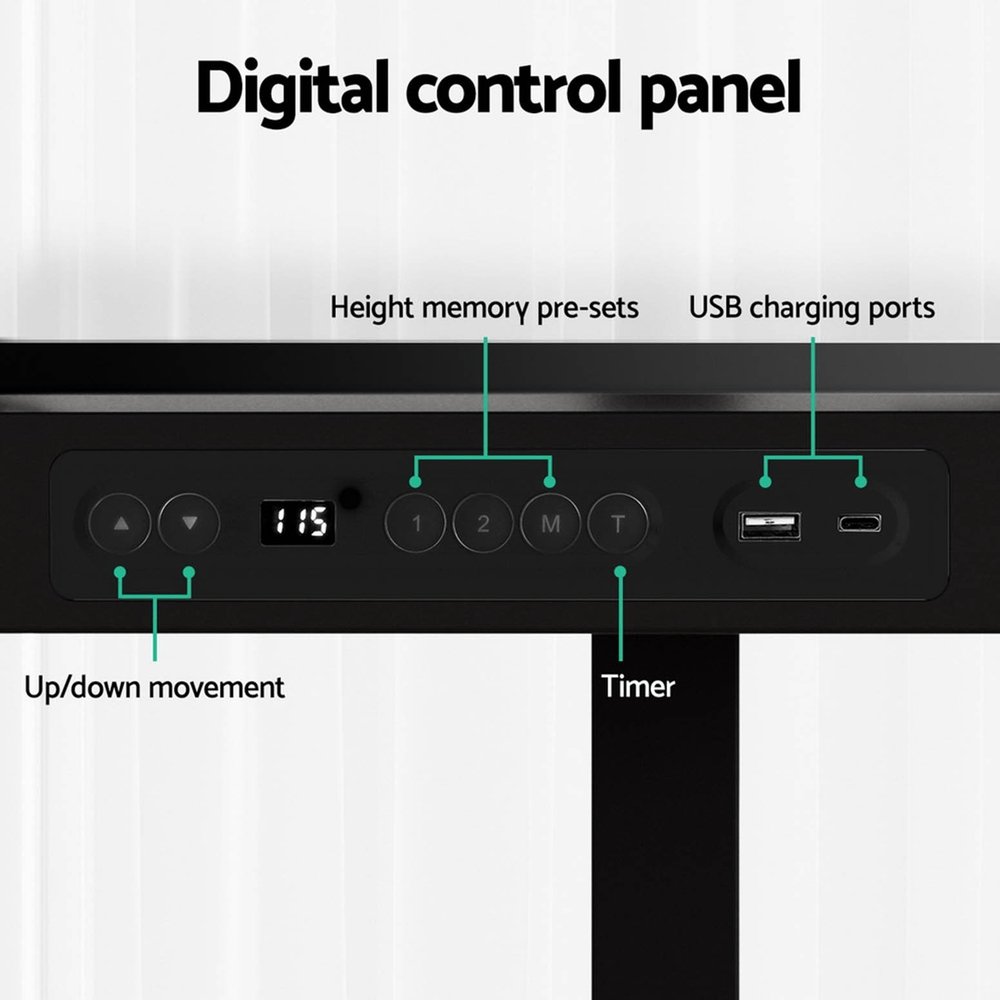 Do you experience poor posture or mysterious pains while working? Keep your back and health in good shape with an Artiss Sit Stand Desk. With our stepless height-adjustable desk frame, you can stand while working and stretch and engage your muscles to prevent them from weakening. Our high-quality powder-coated desk frame makes cleaning and maintenance easy and ensures ultimate sturdiness. It features an easy-to-use digital control panel that enables you to easily adjust the desk to a suitable height, and you can save up to two preset heights for a seamless transition. The reminder mechanism will let you know the optimal time to switch positions. The smooth motors allow for ultra-quiet operation with low energy consumption. A large storage drawer will keep your work essentials at hand while preventing clutter. USB charging ports allow you to charge all your necessary devices while working. Best of all, the desk is easy to set up, so you can get to work right away. Enjoy improved posture, reduced fatigue and increased productivity with an Artiss Sit Stand Desk.