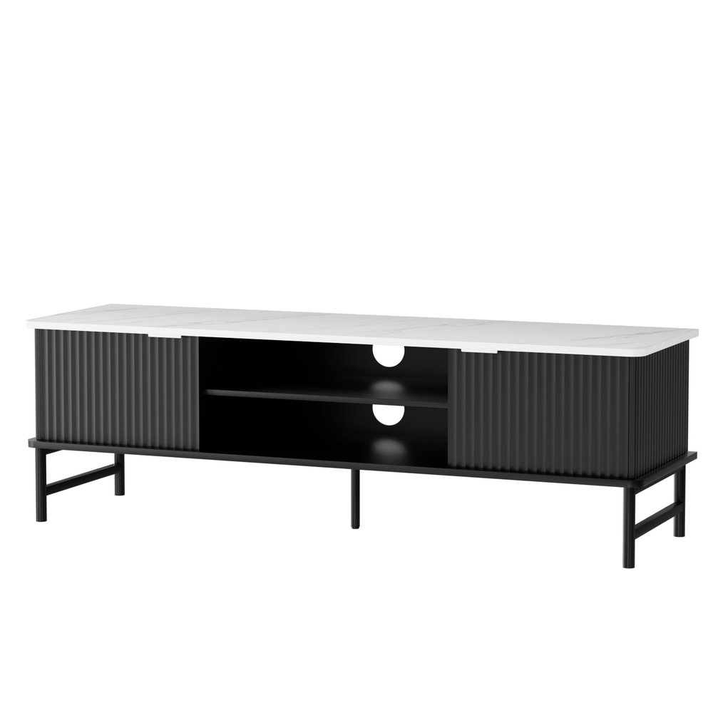 Introducing the Kaisu Entertainment Unit, a stylish and functional addition to your living space. This unit features a marble-effect tabletop, two cabinets with reeded door panels and two open shelves, adding a touch of elegance to its design. With its sturdy construction and adjustable metal legs, it not only provides durability but also adds a modern flair to your room. The Kaisu Entertainment Unit is not only aesthetically pleasing but also practical. It comes with floor protectors to prevent any damage to your floors and cable management to keep your wires organised and tangle-free. With its high weight capacity, you can confidently store your entertainment devices and accessories. Assembly is a breeze, making it easy for you to set up and enjoy your entertainment area in no time. Entertain in style with the Kaisu Entertainment Unit from Artiss.