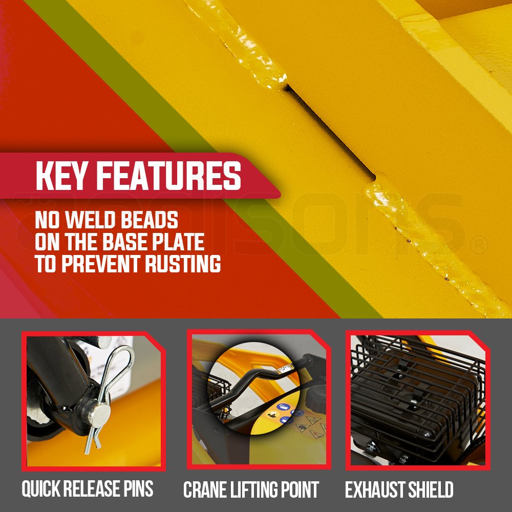 The high-power design combined with a serious 111kg max operational weight and solid one-piece prime strength steel plate guarantees firm level soil compression. Tapered edges of the base plate offer optimal manoeuvrability, so you’ll be able to make light work of compacting sand, soil and gravel in confined spaces.