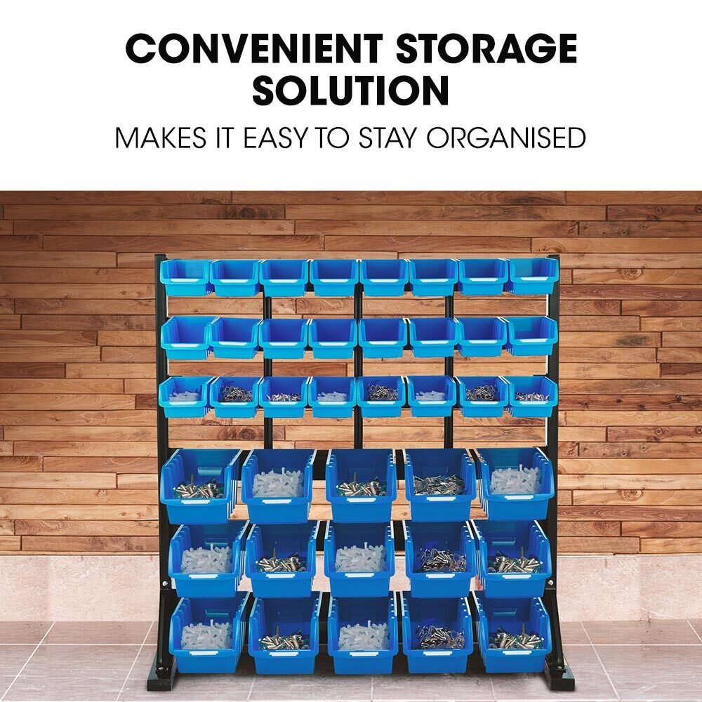 This Baumr-AG Floor Standing Bin Rack makes organising, storing and retrieving loose parts and tools effortless and convenient. This 6-tier Bin Rack is constructed from heavy-duty 20 gauge steel with a durable powder coated finish and sturdy legs. With 39 bins included, it’s ideal for organising tools, hardware and small parts in a home garage, warehouse or workshop.
