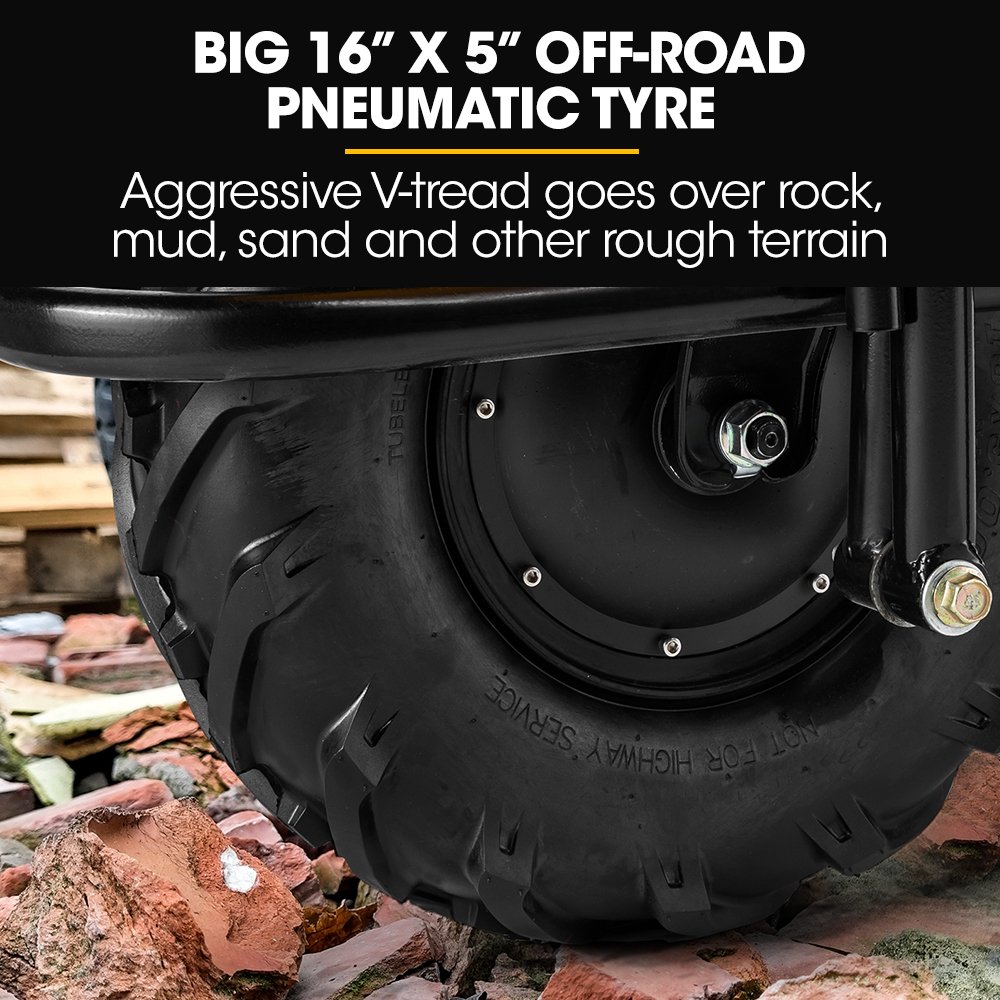 The deep 16″ x 5″ inch aggressive deep V-tread front tyre provides superior traction and drive. The large 10″ rear tyres can handle rough terrain in gardens, on worksites and makes moving material over long distances easy. The drive wheel has an electronic brake to ensure stability and control – and makes emptying easy!