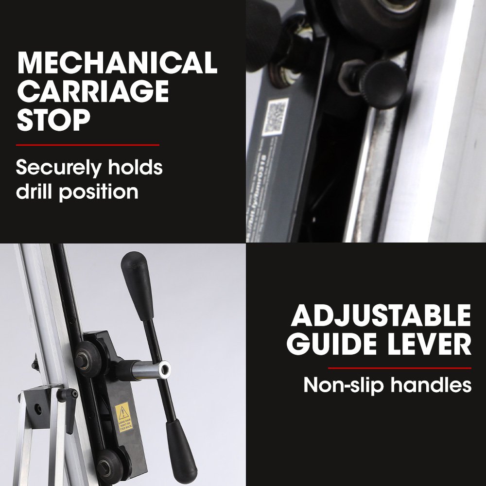 The handle is adjustable and ambidextrous. Its non-slip texture ensures a secure grip, allowing for precise control and reduced fatigue during extended usage. The tool-free angle adjustment, precision drill carriage and carriage brake make this not only easy to use but also provide additional safety and protection for the operator.
