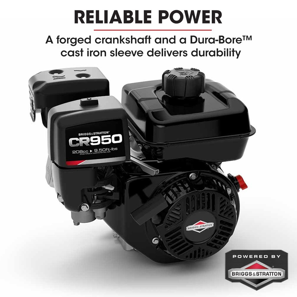 - Engine: Briggs Stratton CR950, 208cc, 6.5HP 4-Stroke