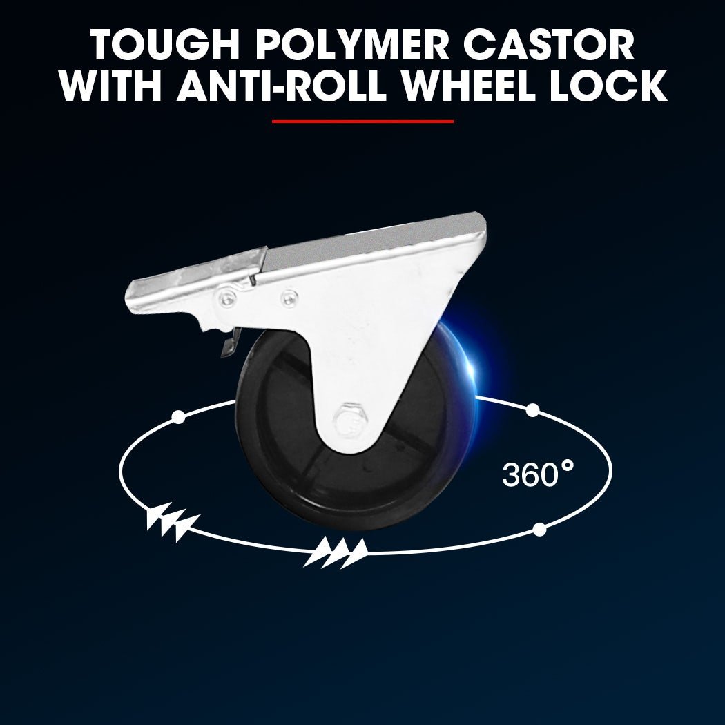 The Bullet 3 Drawer storage trolley comes with an upper chest where valuable or often “borrowed” items can be stored. The drawers have varying depths and sizes to accommodate all types of equipment and parts. The lower cabinet features a self-contained door that stays open and out of the way for easy access to its contents. This space is large enough to keep a range of bulkier items. The cabinet sits on top of four caster wheels with 2 x caster locks, so you have the option to secure it in one place or move it with you around a workspace. This compact double unit fits discreetly in even the smallest spaces or storage areas.