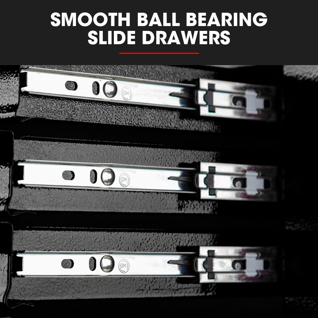 The cabinet is built with a high tensile powder coated steel enclosure. Equipped with an EVA mat, each drawer slides effortlessly in and out on smooth ball bearing rails, which makes finding and accessing each tool a cinch.