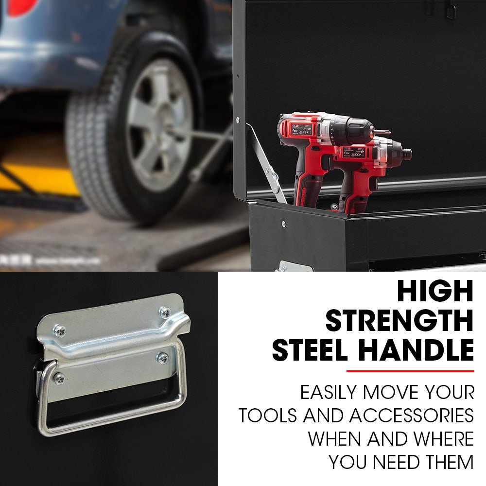 The chest is built with a high tensile powder coated steel enclosure. Each drawer slides effortlessly in and out on smooth ball bearing rails, which makes finding and accessing each tool a cinch, and each drawer contains an EVA mat to protect the tools. The unit is easily transportable, thanks to its side carry handles.