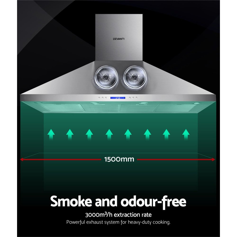 Thick smoke and steam from your cooking. Stifling odours all around. And the hood’s not doing its work in clearing the mess. Yes, it’s the bane of every conscientious chef who wants the cooking environment to be as pleasant as possible. And that wish has come true with our Devanti 1500mm wall mount range hood.