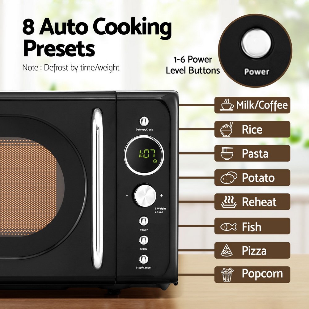 The Devanti 20L Microwave Oven is designed to bring convenience and efficiency to your kitchen. This microwave combines functionality with a modern aesthetic. Equipped with a 24-hour timer, it allows you to set cooking times with precision, while the one-touch express cooking function ensures quick and easy meal preparation. With five power levels and eight auto cooking menus, this microwave is versatile enough for a range of dishes, from reheating to defrosting.
