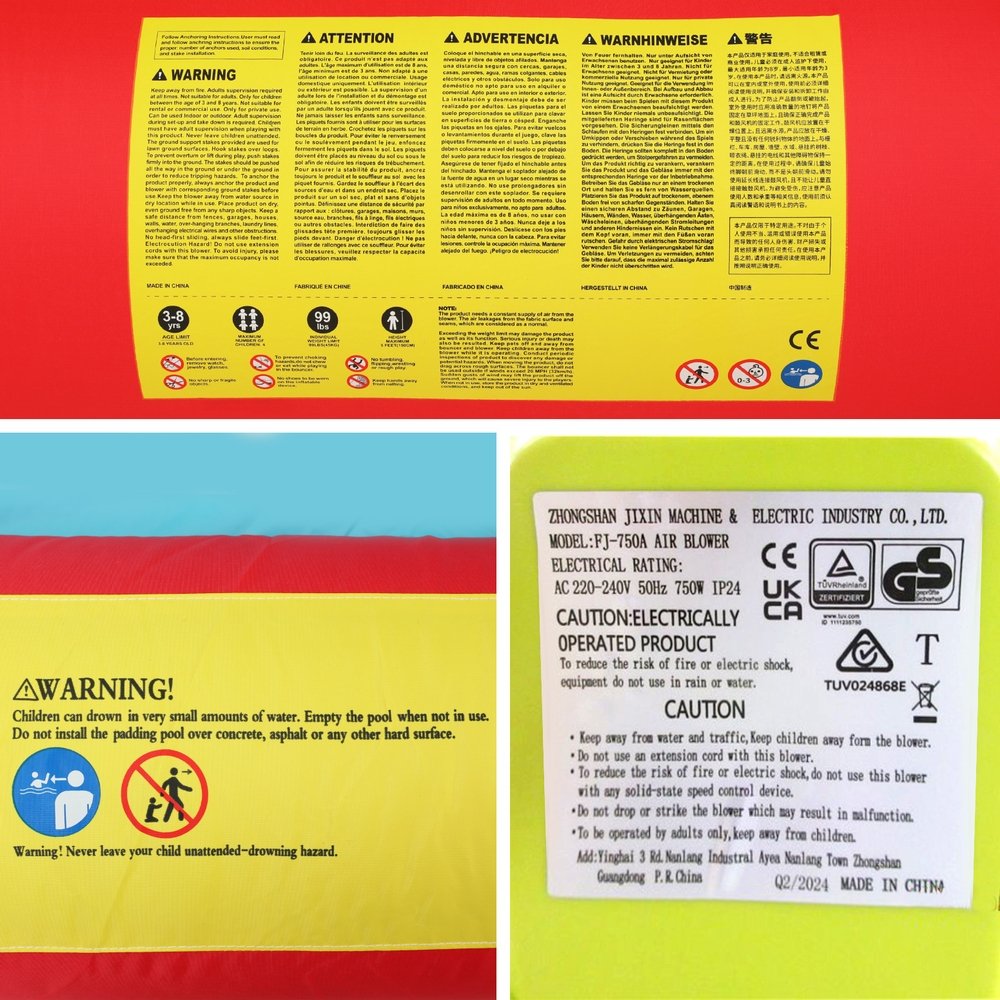 Kids water park with two slides, trampoline, climbing wall and water cannon