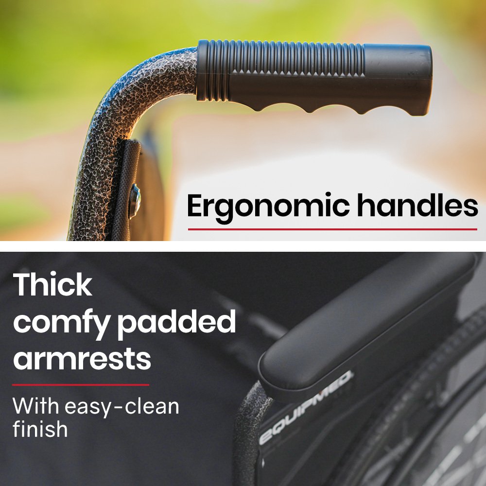 This Equipmed wheel chair features height adjustable footrests that also swing out for easy access onto the wheel chair. Combined with a generous 51cm seat width, the comfy padded armrests and a padded seat with generously proportioned backrest ensure a comfortable ride. The armrests have quick release levers which allow them to swing back to allow for convenient access at tables when dining. And, thanks to the 2 second folding action and ergonomic handles, it makes for a relaxing day out for any helpers, too!