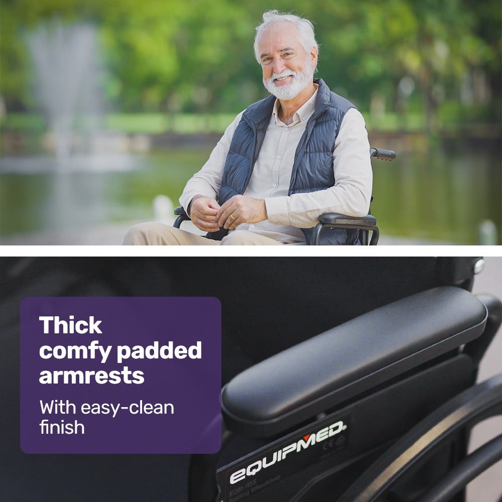 This Equipmed wheel chair features height adjustable footrests that also swing out for easy access onto the wheel chair. Combined with a generous 51cm seat width, the comfy padded armrests and a padded seat with generously proportioned backrest ensure a comfortable ride. The armrests have quick release levers which allow them to swing back to allow for convenient access at tables when dining. And, thanks to the 2 second folding action and ergonomic handles, it makes for a relaxing day out for any helpers, too!