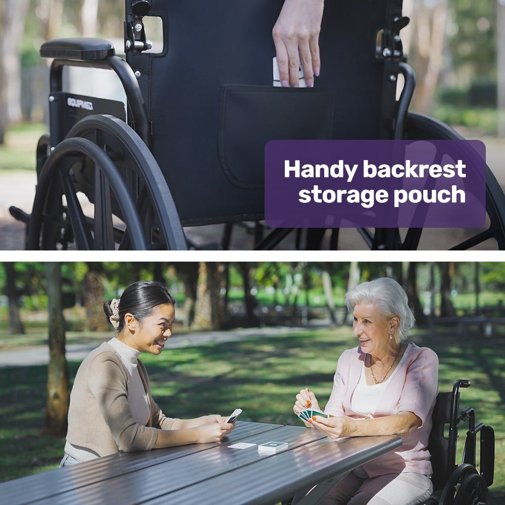 Activating the easy access park brake levers locks the wheels into position a perfect time to pull out some reading material from the backrest pouch! This Equipmed Wheelchair certainly ticks all the boxes. Make the smart choice and enjoy well-deserved mobility!