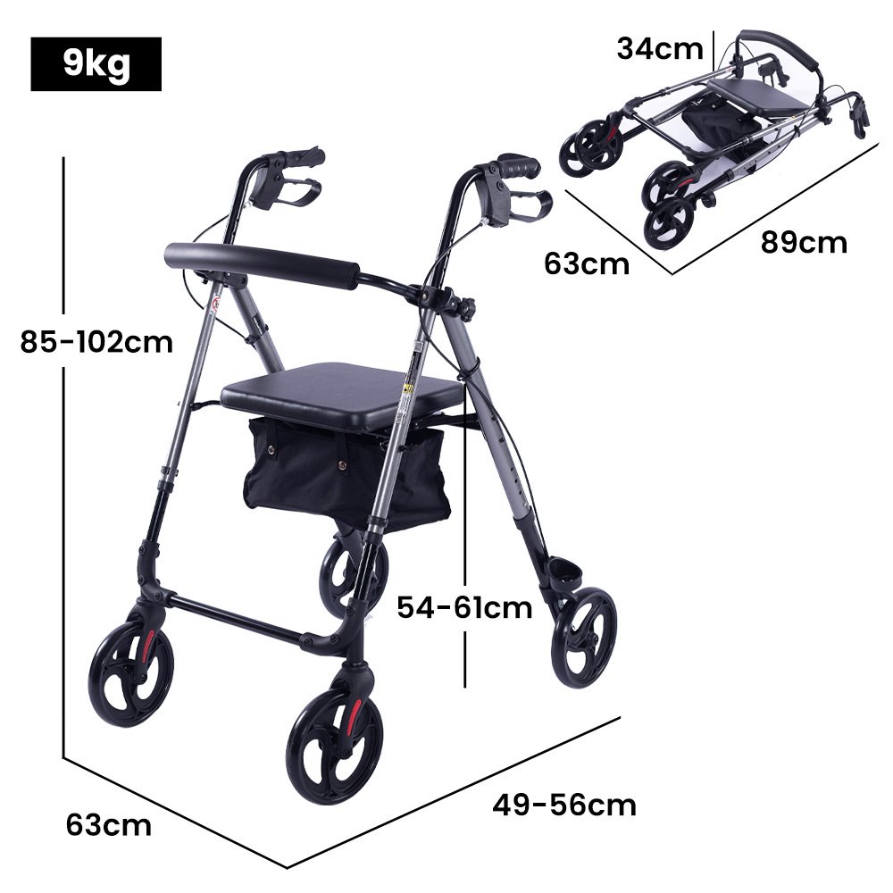 EQUIPMED 4 Wheel Lightweight Rollator Walker, Aluminium Frame, Seat, Carry Bag, for Seniors, Titanium Style