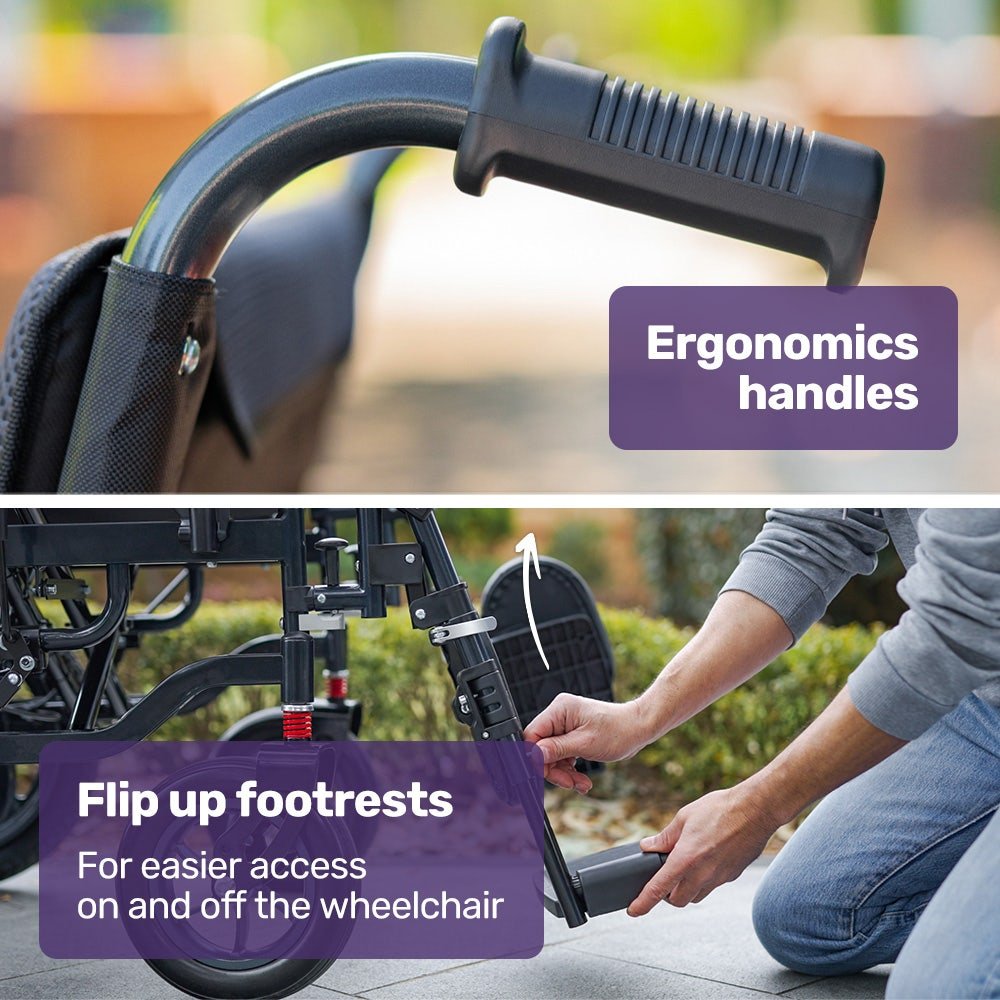 • Easy access and exit with flip-up armrests and fold-up foot rest
