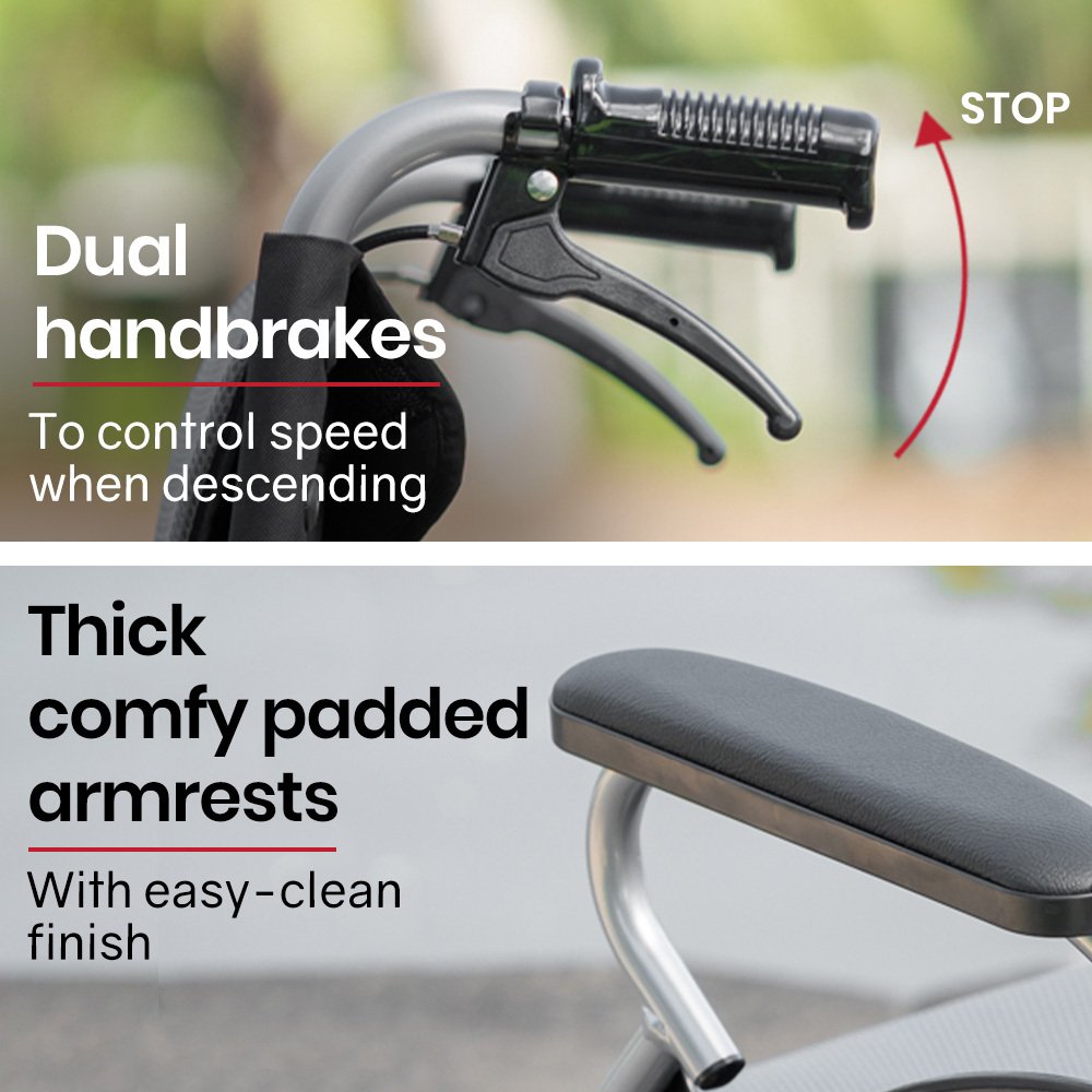 This premium lightweight wheelchair features fold up footrests allowing for access onto the wheelchair. The comfy padded seat and generously proportioned backrest ensure a comfortable ride. And, thanks to the 2 second folding action and ergonomic handles, it makes for a relaxing day out for any helpers, too! They can activate the easy access dual brakes to safely go down hills and ramps, while dual parking brakes can lock the wheels into position a perfect time to pull out some reading material from the backrest pouch!