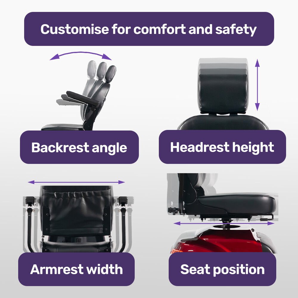 This ultra-sturdy XL-sized model offers a smooth, stable ride designed for comfort. With adjustable armrest width, headrest height, and seat position, you can personalise your fit for ultimate support and relaxation. Thick, cushioned padding on both the seat and armrests makes every journey a pleasureperfect for all-day use.
