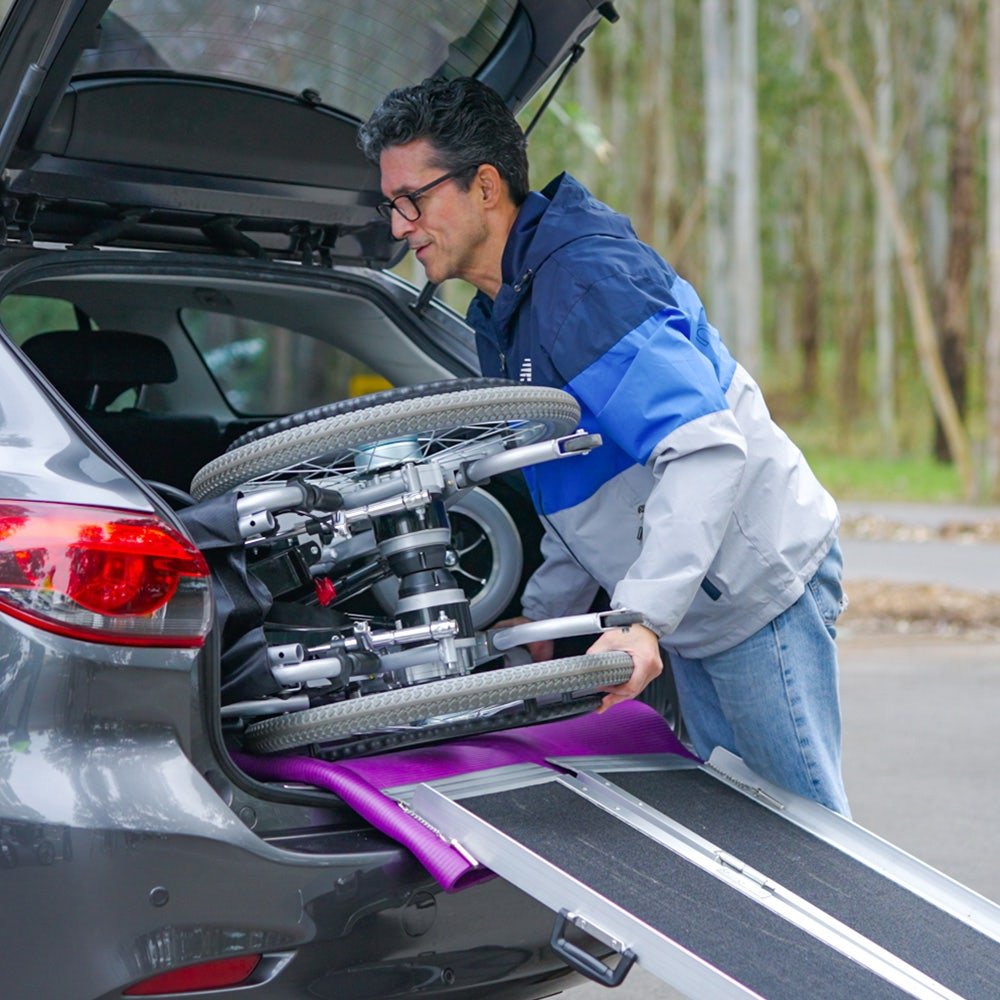 The Equipmed motorised power wheelchair is quick to fold. Plus, a sturdy steel frame and easy-to-remove lithium battery mean that it is as light as possible for loading into a car boot or moving into a space-saving storage position.