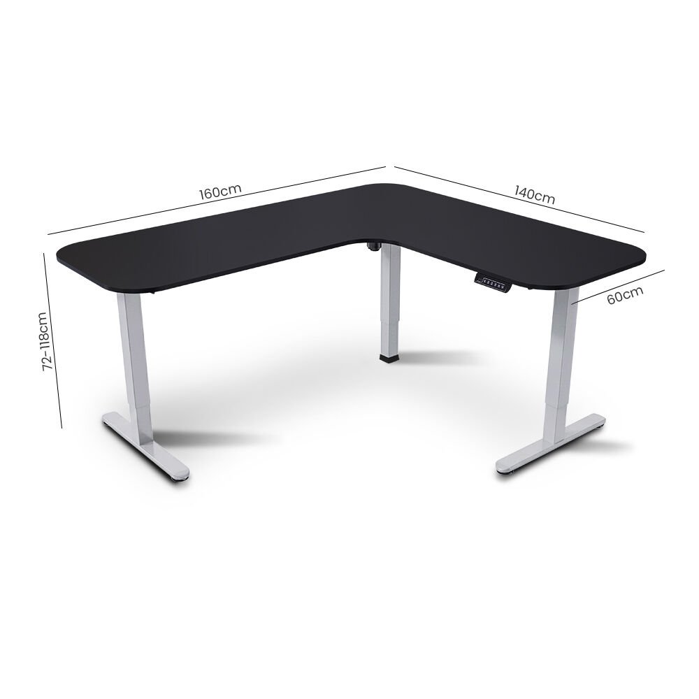 FORTIA Corner Standing Desk, 160x140cm, 72-118cm Sit to Stand Up Electric Height Adjustable, Black Desktop/Silver Frame