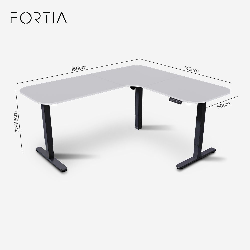 FORTIA Corner Standing Desk, 160x140cm, 72-118cm Sit to Stand Up Electric Height Adjustable, White Desktop/Black Frame