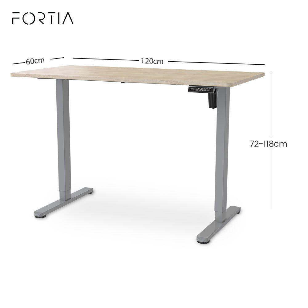 FORTIA Sit To Stand Standing Desk, 120x60cm, 72-118cm Electric Height Adjustable, Light Oak Style Desktop Silver Frame