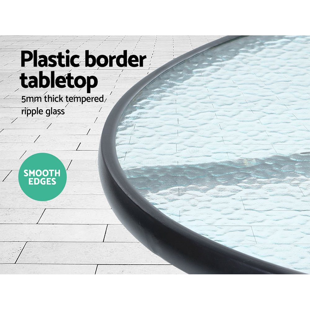 Enjoy the pleasant outdoors or have a nice chat with friends over a cuppa with our Gardeon Outdoor Bistro Set. With its chic and trendy profile, the set comes with a glass-top table and two wicker chairs. The elegant table is stunning in looks and equally as functional. The thick steel frame makes it durable and the 5mm thick tempered ripple glass does not only look stylish, it is easy to clean. Plus, there is a built-in hole for your parasol for you to relax outdoors for as long as you like during the hot summers without the fear of getting sunburnt. The chair is finished in meticulously weaved UV-resistant and weather-resistant PE wicker with a strong and sturdy steel frame construction. The exotic design, spacious seating and 5cm thick high-density foam cushions ensure comfort and style are always in place. Best of all, the removable and washable seat cushion cover makes cleaning up hassle-free. Together, the set is designed to please as well as stand up to the weather elements and the non-slip feet make the set suitable for use in even the most slippery of situations. With so much going for it, the bistro set certainly deserves its coveted space in your lovely backyard, deck or patio. Or even indoors for a unique presence.