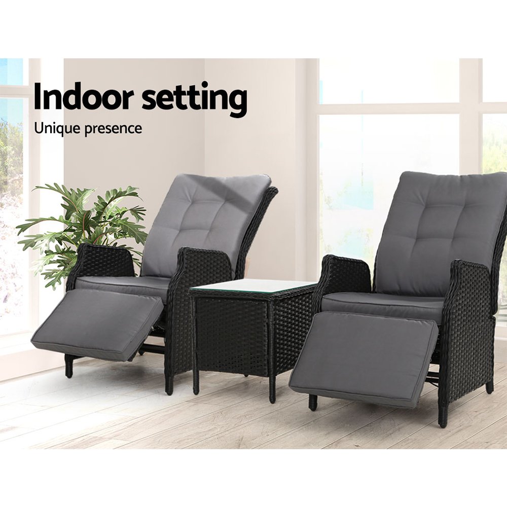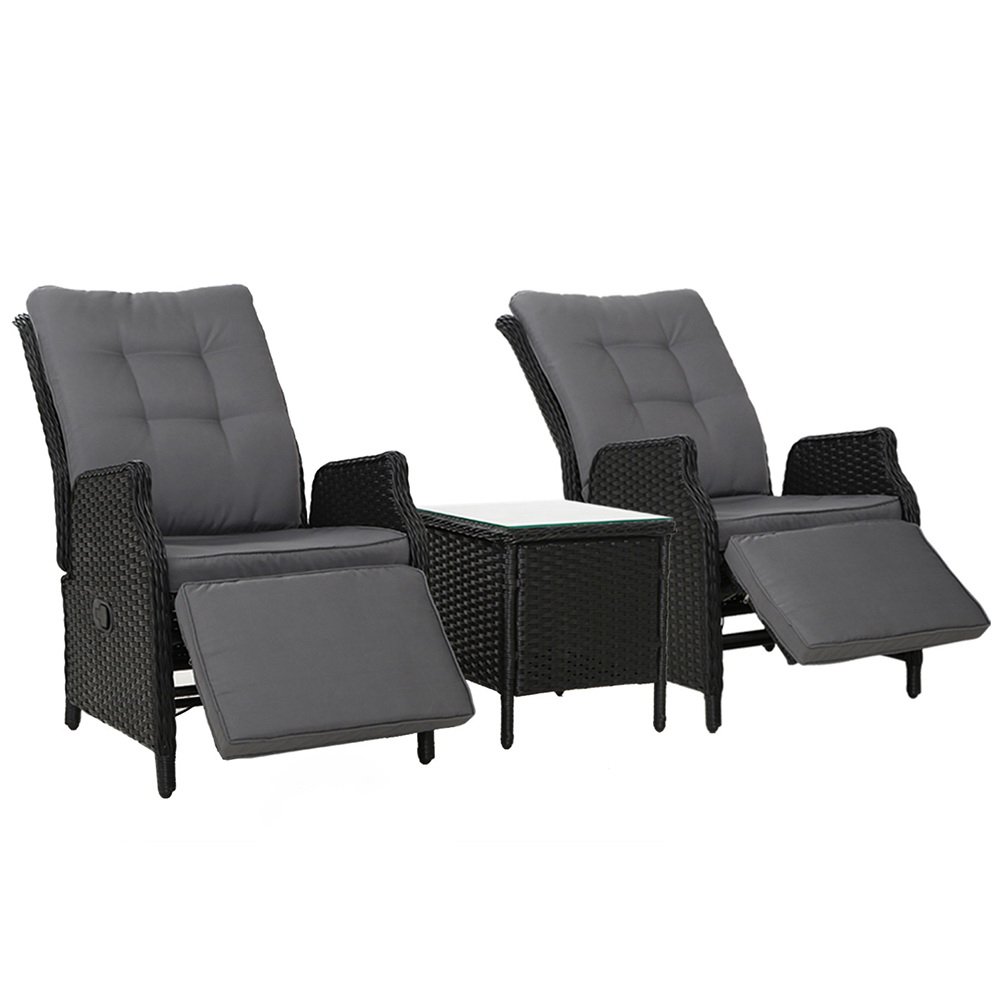 Gardeon 3PC Recliner Chairs Table Sun lounge Outdoor Furniture Wicker Adjustable Black