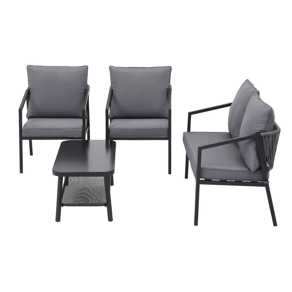 Looking to create a chic and gorgeous outdoor setting? The Gardeon 4-piece outdoor lounge set is a must purchase. It will liven up your outdoor space and help you achieve an elegant space where you can enjoy day and night and summer and winter. This 4-seater set comprises of two single sofas, one 2-seater sofa, and a matching centre table. You can arrange them in multiple ways to suit your space. Its beautiful and versatile design makes it perfect for both indoor and outdoor use. The backrest of the chairs feature a metal frame covered by handcrafted rope, while the outdoor cushions use water-resistant covers, and 8cm thickness for comfort. Additionally, the matching table with 5mm thick tempered glass top, and durable powder-coated frame ensures strength and durability. You can create a praise-worthy spot with just a little creativity that will wow your guests. Shop it for your home today.