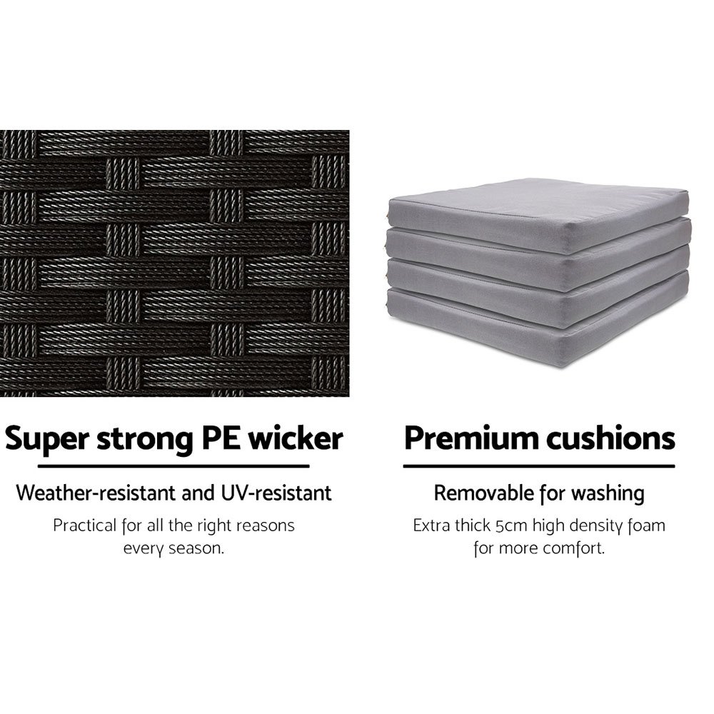 Looking as stunning as ever in an upgraded design, our Gardeon Outdoor Bar Set certainly deserves its coveted space in your lovely backyard, deck or patio. With its chic and trendy profile, the bar set comes with a table and matching bar stools, with ample seating for all your friends and family. And as the seats have inclined backrests and extra-comfy 5cm thick foam cushions, you can socialise for hours on end without aching backs or bottoms. If you spill your drink, the 5mm tempered glass tabletop and removable seat cushion covers make cleaning up hassle-free. With powder-coated steel construction and quality PE wicker finish, the bar set is designed to handle the rain and sun without any worries for years to come. When not in use, you can save loads of space by pushing 2 chairs under the table.