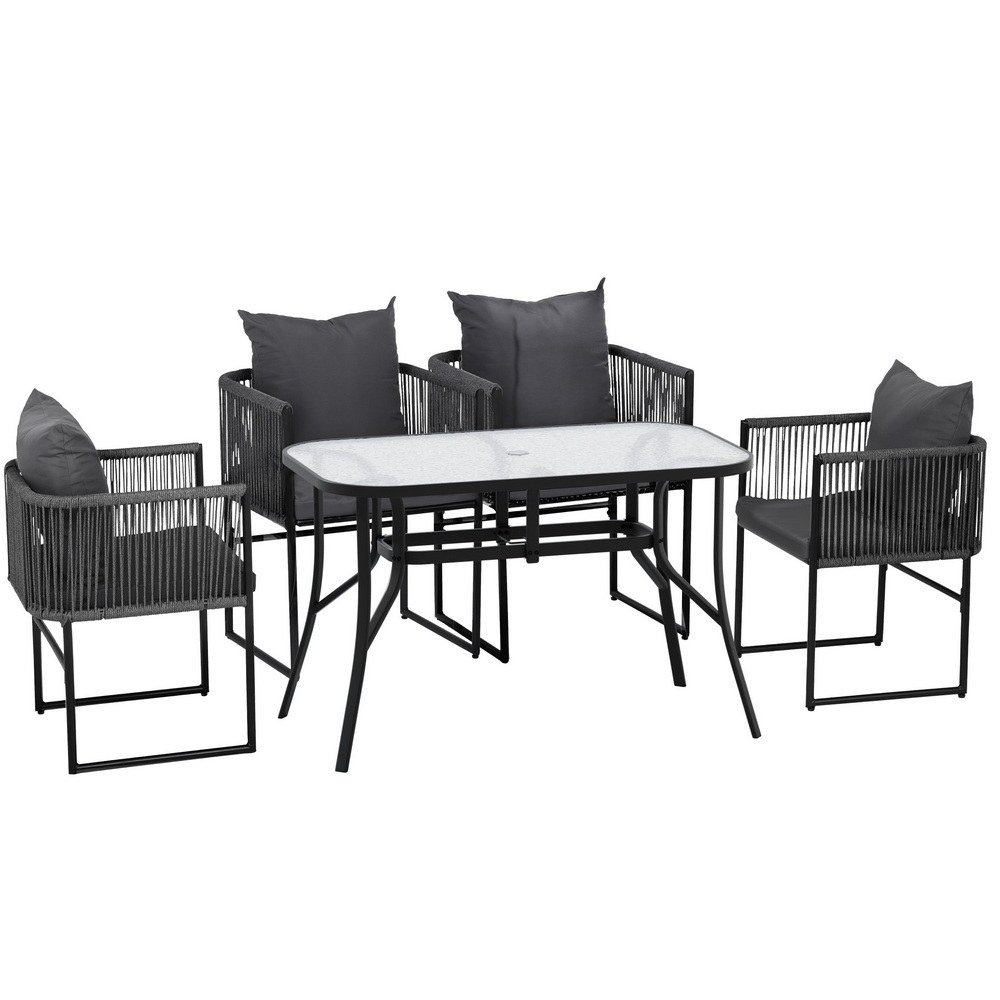Elevate outdoor living with the Gardeon 5-Piece Outdoor Dining Set��perfect for sunny gatherings! The rust-proof powder-coated steel frame ensures lasting durability, while the all-weather synthetic fabric resists sun, rain, and stains. The set features 190g polyester rope chairs with sturdy steel frames for breathable comfort and stability, paired with a tempered glass table that includes a convenient parasol hole for shade. With floor protectors for added stability and a sleek, versatile design, this low-maintenance set transitions seamlessly from patio to indoor dining��ideal for relaxing meals under the open sky!
