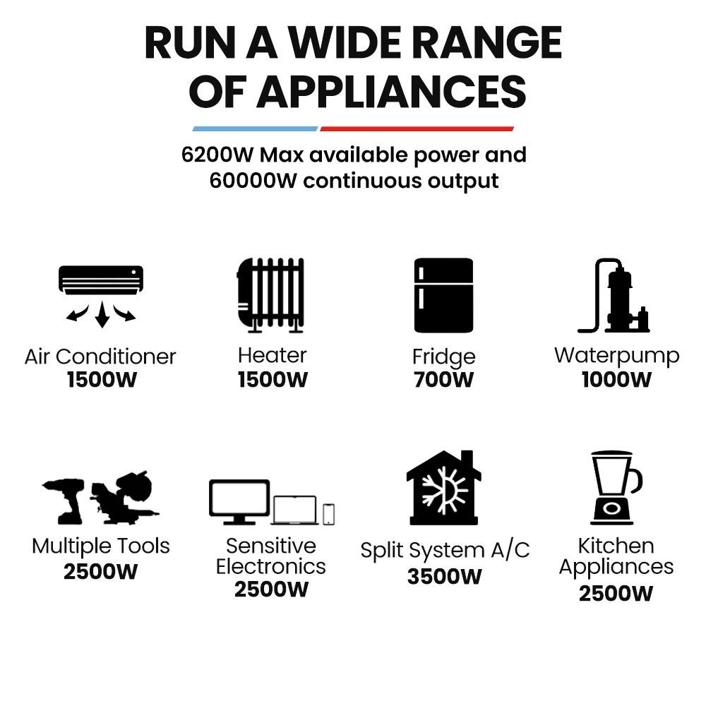 • 6200W peak / 6000W continuous for home, leisure, or work
