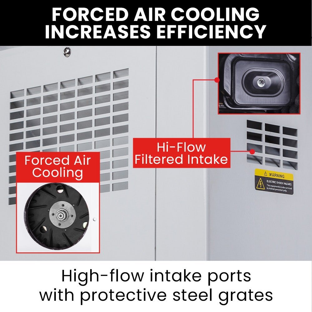 - Enclosure: 3mm High Tensile Powder Coated Steel, Sound Insulated Dampened