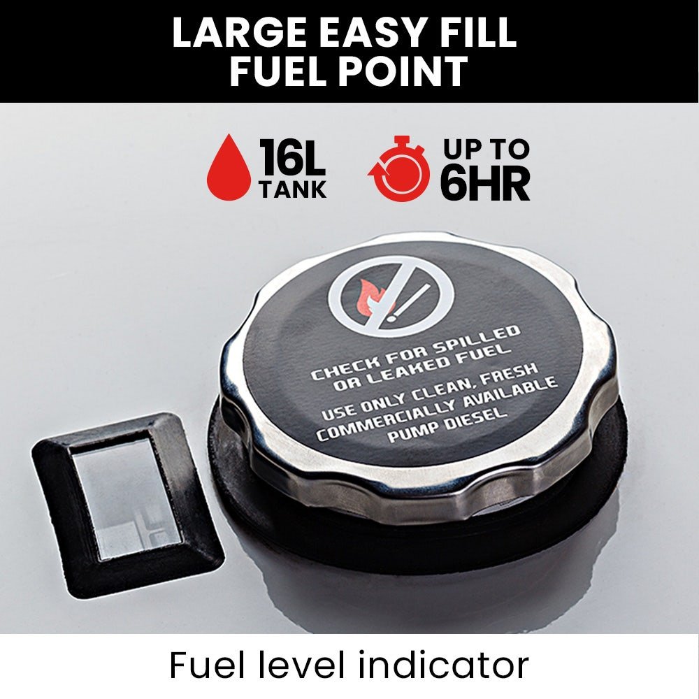 - 16L fuel tank for up to 6 hours runtime