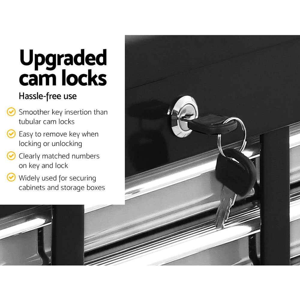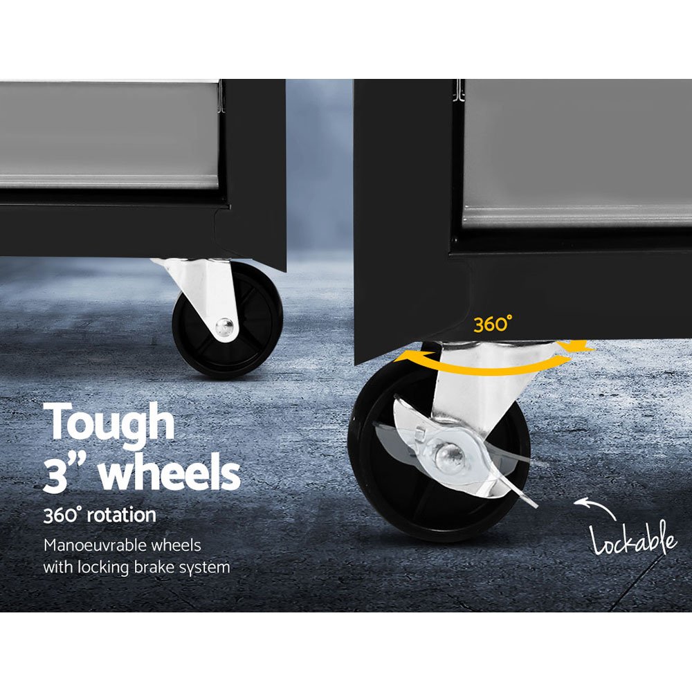 This robust, multi-drawer Giantz Tool Trolley is an essential for any workshop. Crafted from durable steel, it features smooth ball-bearing slides for easy access and a secure lock system for safety. Its spacious design includes varying drawer sizes to accommodate tools of all shapes, complete with non-slip liners. The chest is also mounted on omni-directional castors with locakble front wheels, ensuring a smooth maneuverability and stable positioning. Sleek and functional, it’s perfect for organizing and protecting your valuable tools.