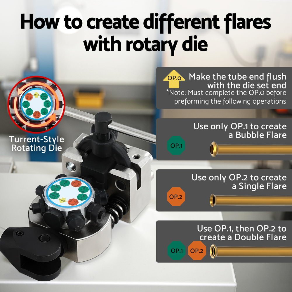 It features a turret-style 45° flaring tool, four interchangeable dies, and a heavy-duty 40CR steel pipe cutter – ideal for flaring steel, copper, and stainless steel tubing with confidence.