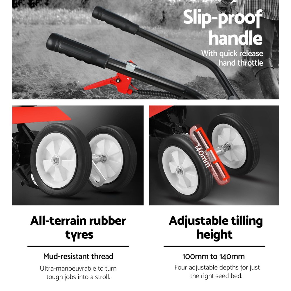 Get the earth moving quick and easy with the GIANTZ Hand-held Tiller. Featuring a 63cc 7500rpm±500rpm 2-stroke petrol motor, the tiller churns out soil deep and wide with its 24 teeth of hardened steel tines. The 4 blades allows you to till an extra-wide swath of 400mm and up to 150mm in depth. In other words, you only need one pass with the tiller to pulverise the soil and get the right seedbed for your favourite crops. Operating the tiller is just as easy with its pull-start improved engine, steady handle and quick-release hand throttle control and all-terrain rubber tyres to transform back-breaking tilling work into a ground-breaking stroll. And when the tilling is done, just fold away the tiller and store with the rest of your tools. Ideal for the home gardener or small-scale commercial grower. This item comes with 1 year warranty.