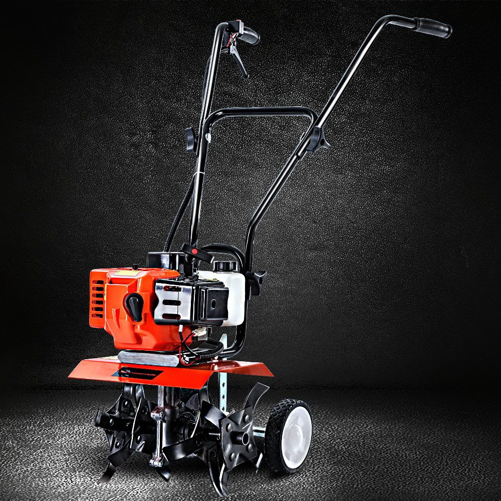 Get the earth moving quick and easy with the GIANTZ Hand-held Tiller. Featuring a 65cc 7500rpm 2-stroke petrol motor, the tiller churns out soil deep and wide with its 16 teeth of hardened steel tines. The four blades allows you to till an extra-wide swath of 300mm and up to 150mm in depth. In other words, you only need one pass with the tiller to pulverise the soil and get the right seedbed for your favourite crops. Operating the tiller is just as easy with its pull-start improved engine, steady handle and quick-release hand throttle control and all-terrain rubber tyres to transform back-breaking tilling work into a ground-breaking stroll. And when the tilling is done, just fold away the tiller and store with the rest of your tools. Ideal for the home gardener or small-scale commercial grower.