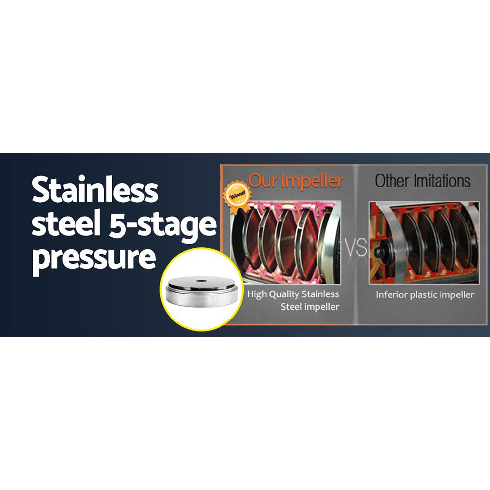 When low water pressure gets you down, power it up with our Giantz 5-stage Water Pump. It is the perfect solution where constant on-demand water pressure is needed at the open and close of any tap. You will find our water pump particularly useful for homes, household gardens, farms, or any situation where pressurised water is consistently required. The water pump features an IP-rated motor, full stainless steel pump body, cast iron ends, 1.25” inlet and 1” outlet ports, corrosion-resistant brass connectors, efficient cooling system and not least, built-in thermal protection. Pumping out at a rate of Max. 100L/min with a 50m head, the water pump can send water up to two stories high effortlessly. You can also accurately control the pressure to your precise requirements with the fully automatic controller and monitor it at a glance of the pressure gauge. Power to the pump is as simple as plugging it straight into any Australian standard socket. Whether you are using the pump as a permanent installation or on an ad hoc basis, you can be assured of dependable and reliable water supply in more ways than one.