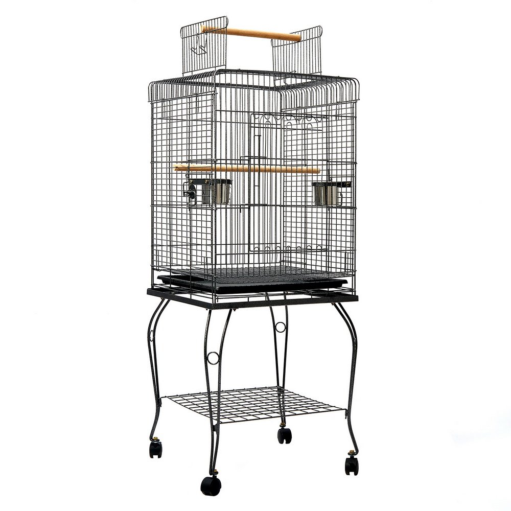 Made of sturdy, high quality and durable powder-coated wrought iron, the cage comes with a large access door, two small side access windows to swing in the stainless steel feeders, two timber perches and a removable tray for easy clean up. Better still, the roof can also be opened from the top.