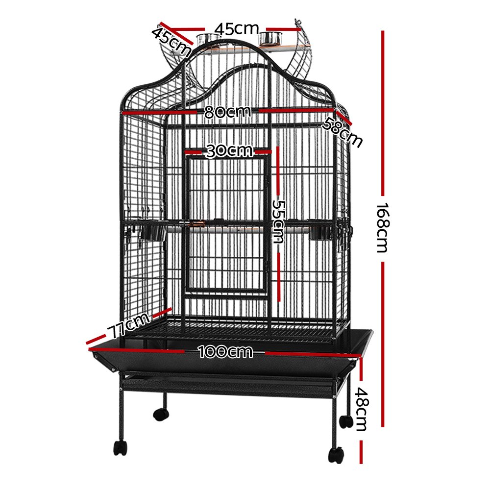 This fantastic and spacious i.Pet Bird Cage with open top is definitely the most comfortable roost for your little one. Our bird cage frame is made of heavy-duty wrought iron with vein powder-coated finish, so it is tough and durable. The size of this cage is perfect for medium and large sized birds and parrots, with ample room for them to move about. You can convert the cage to open roof easily and let your bird perch up high. It also features seed skirts all around the cage, a large access door, small side access windows for stainless steel food/water trays, two timber perches (one with two stainless steel feeders for the open roof), and removable bottom tray for easy clean-up. Best of all, castor wheels are fitted to the matching stand to provide great mobility. Equipped with all the favourite entertainments that a bird would need, your little one will surely love it.