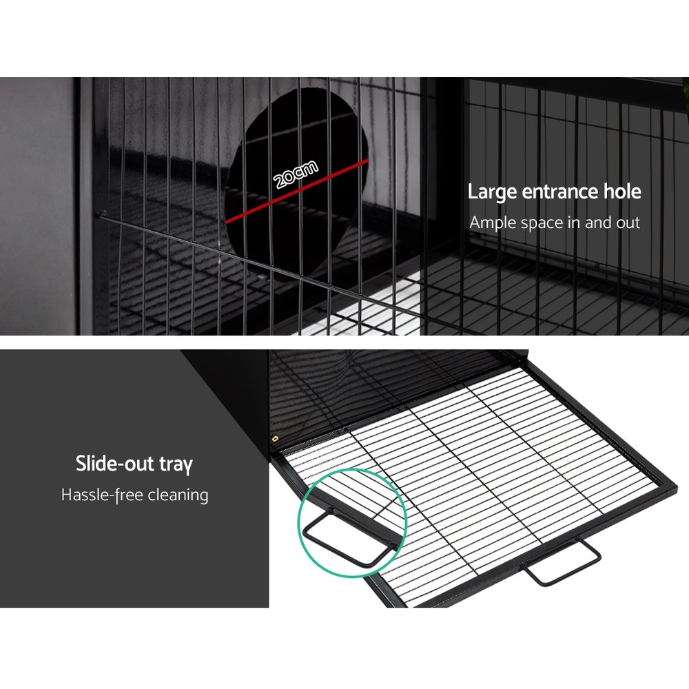 First up, the pitch-roof enclosed shelter has a 20cm diameter slot opening for easy entry and excess and ample space for your pet to rest and snooze. A slide-out mesh tray at the back makes for convenient cleaning without dismantling the whole assembly apart. On top of that, the roof can also be lifted up for more access.