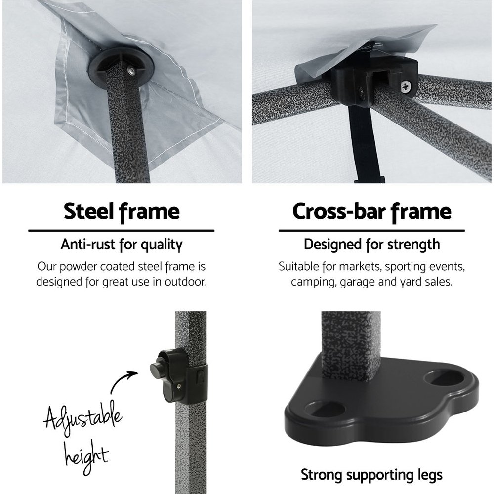 The INSTAHUT gazebo has 3 adjustable height levels to suit different height needs. It is ideal for markets, sporting events, camping, garage and yard sales, school events, trade shows and many more.