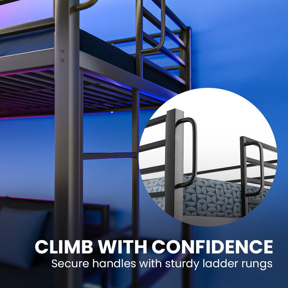Clean lines. No fuss. Its sturdy metal frame suits any room style, while both levels fit standard single mattresses – no custom sizes, no hassle.